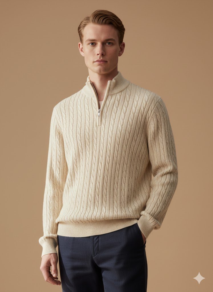 Timeless comfort. This classic cotton cable knit quarter zip sweater provides breathable warmth and elegant texture. A minimalist wardrobe essential.